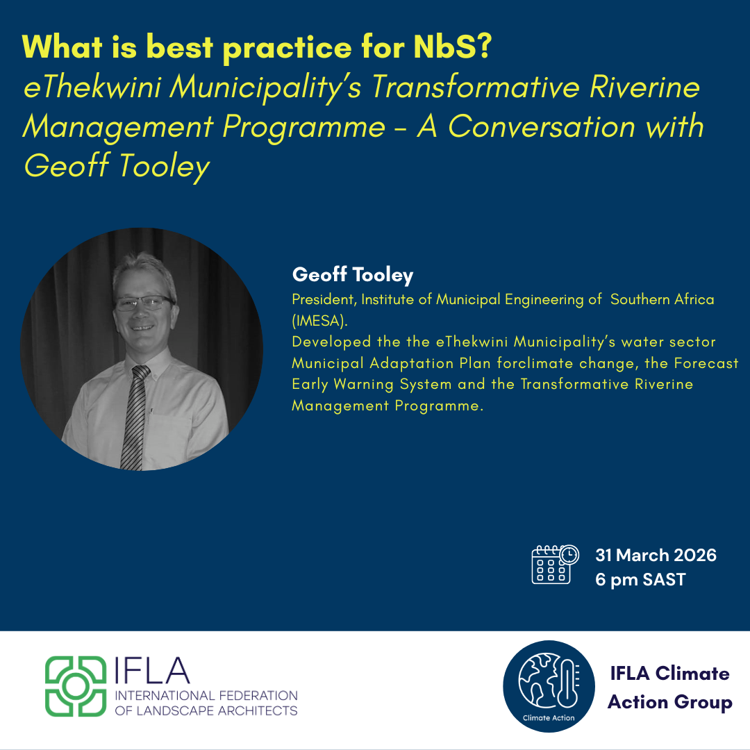 This webinar builds off the IFLA CAG review of the G20 Disaster Risk Reduction – Nature-Based Solutions (NbS) Compendium of Case Studies.