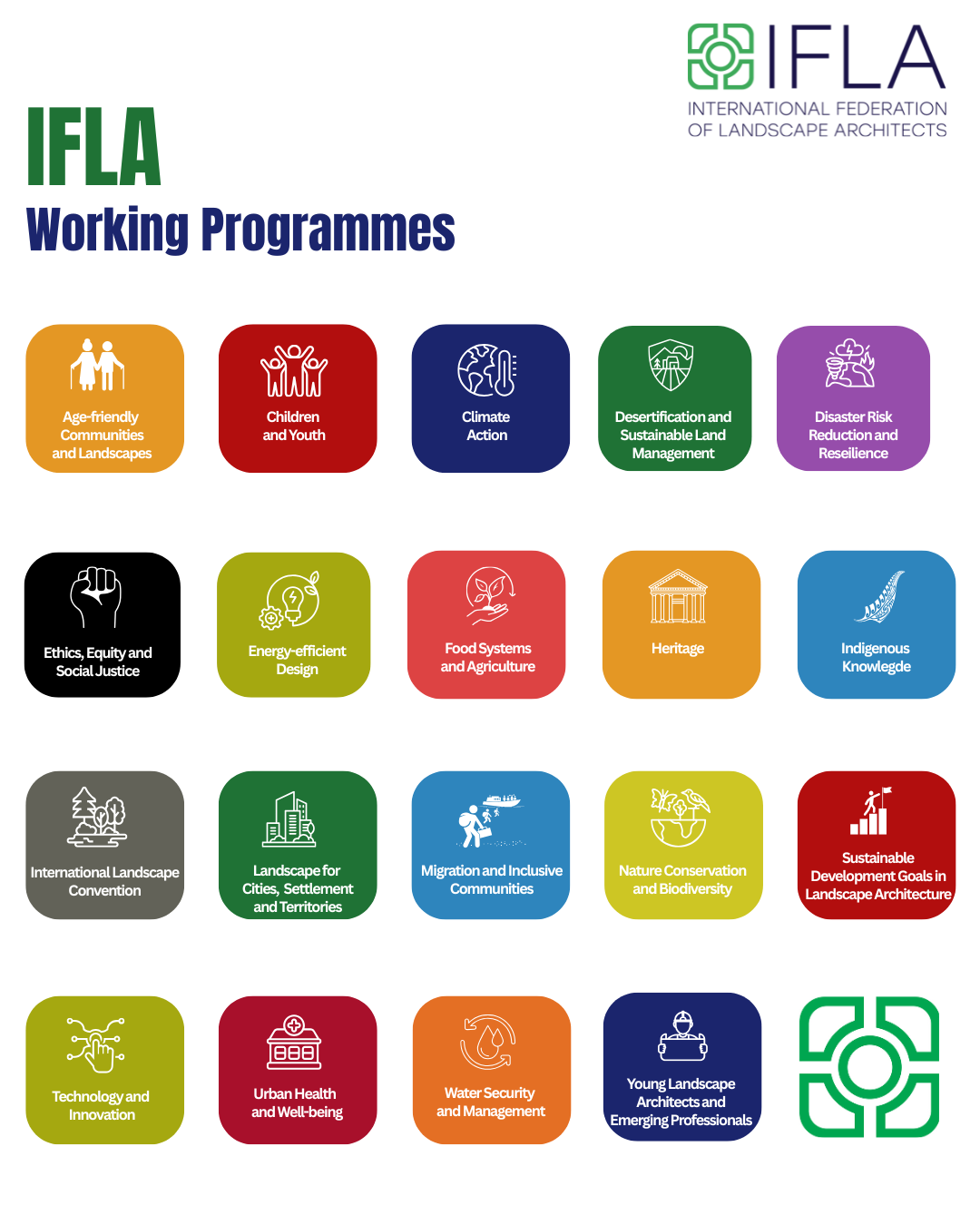 The new Working Programmes structure IFLA's efforts across a wide spectrum of crucial contemporary issues. They aim to reflect the multifaceted dimensions of landscape architecture, align IFLA’s work more closely with the United Nations (UN) and its agencies (such as UNESCO, UN-Habitat, UNEP, WHO, FAO), and foster collaboration with sister organisations (such as ISOCARP, UIA, AIPH, WGIN, URBIO, ISUH).