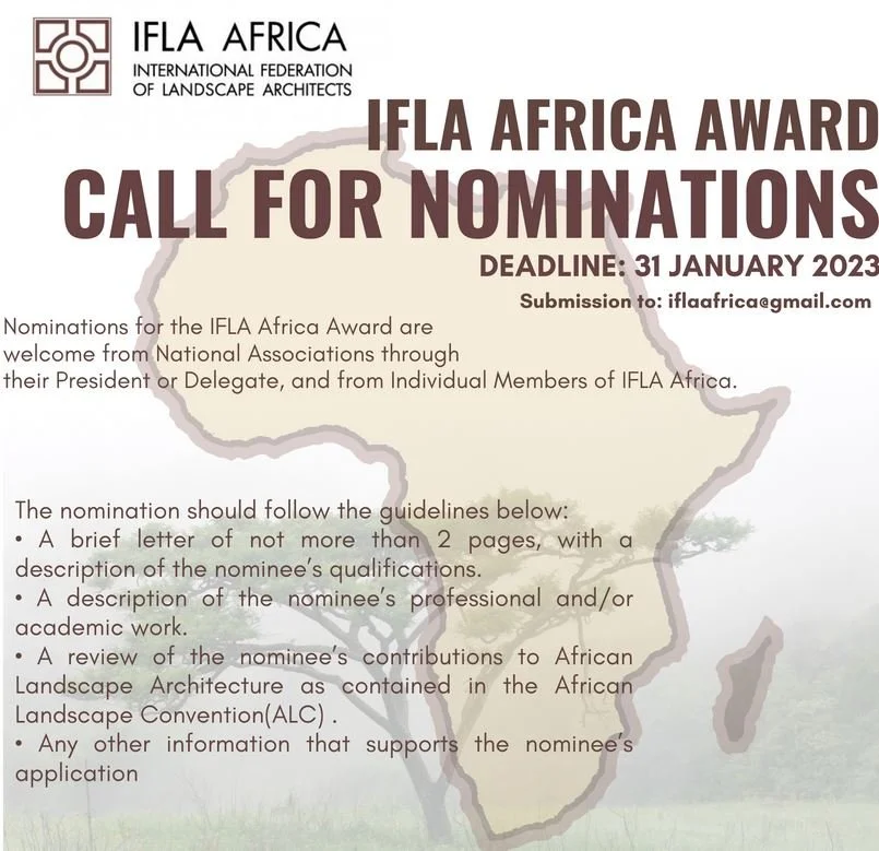 The brand new IFLA Africa Award is an honour that IFLA Africa can bestow on a landscape architect. The Award recognises a living landscape architect whose lifetime achievements and contributions have had a unique and lasting impact on the following: