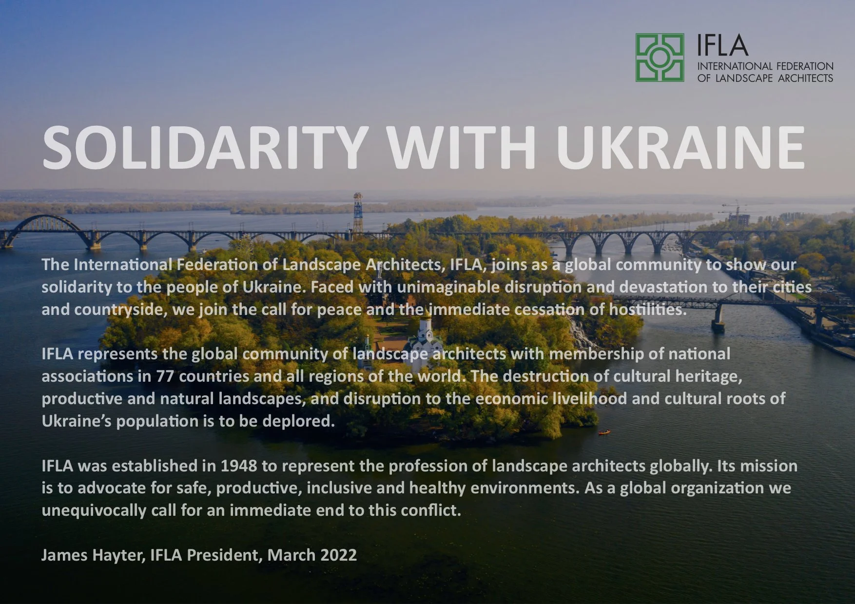 The International Federation of Landscape Architects, IFLA, joins as a global community to show our solidarity to the people of Ukraine. Faced with unimaginable disruption and devastation to their cities and countryside, we join the call for peace and the immediate cessation of hostilities.